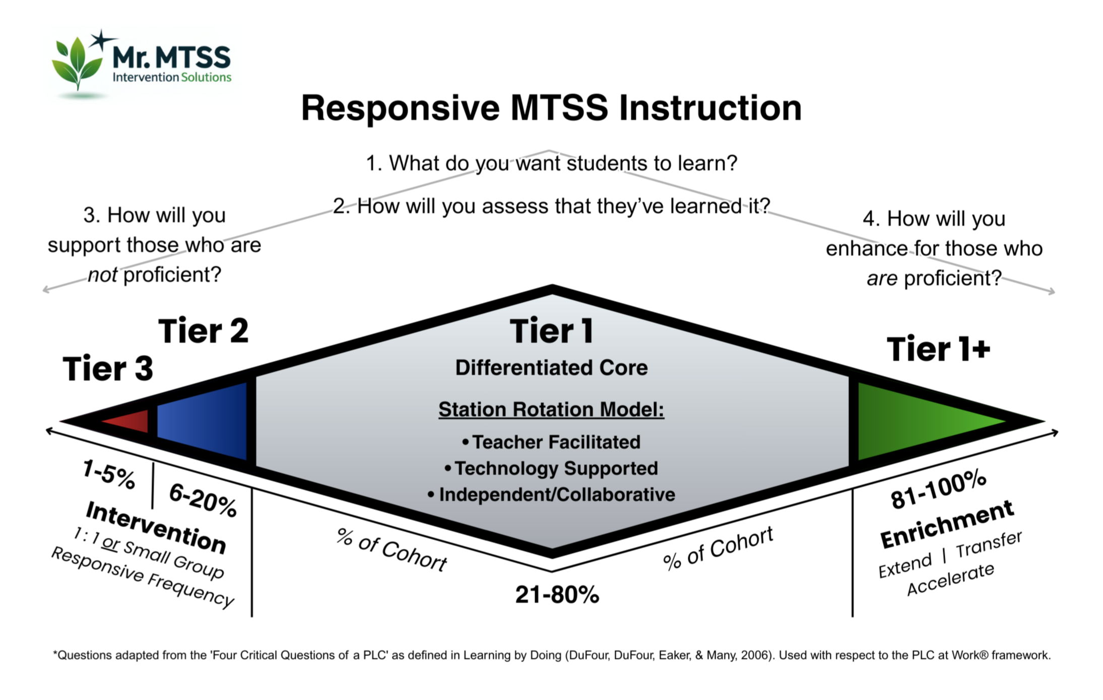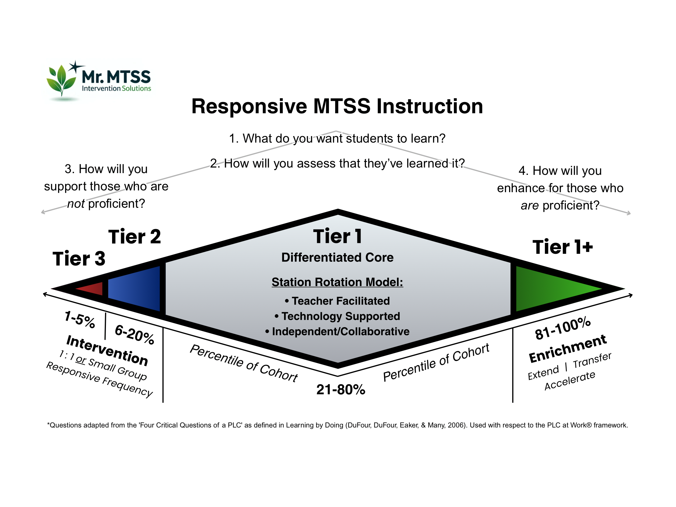 Our diamond model redefines traditional frameworks by emphasizing a strengths-based approach that includes pathways for student acceleration. To address the diverse needs of Tier 1 students, we advocate for a Differentiated Core using a Station Rotation or Blended Learning Model.
